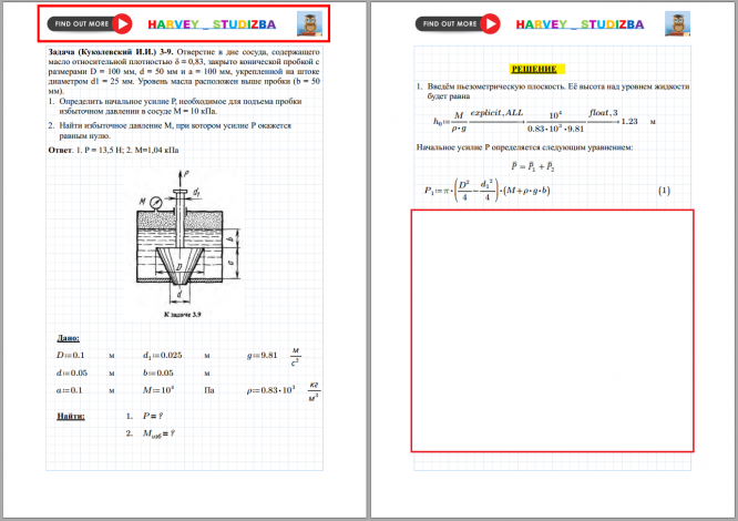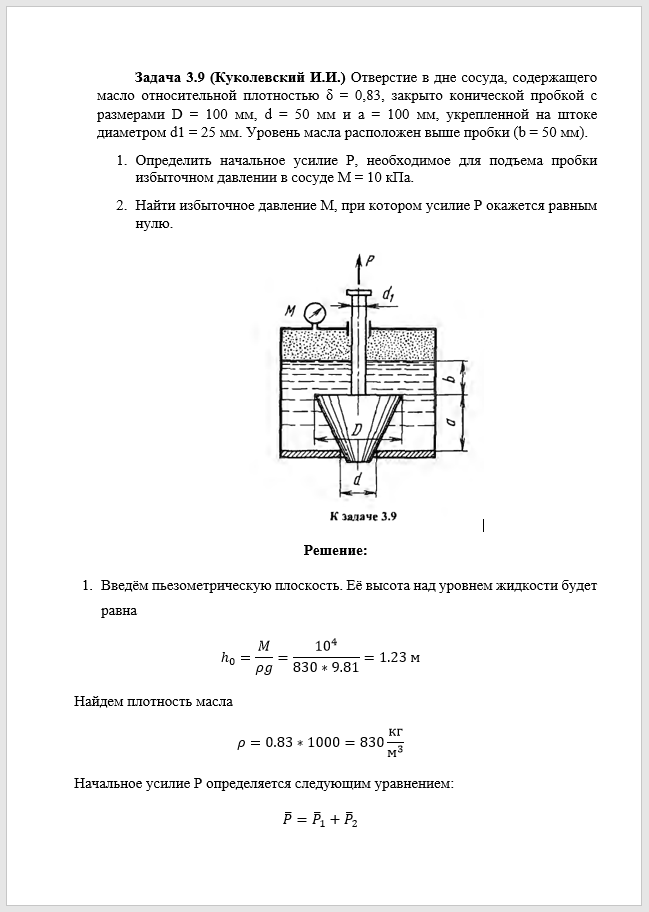 Для студентов по предмету Механика жидкости и газа (МЖГ или Гидравлика)Отверстие в дне сосуда, содержащего масло относительной плотностью δ = 0,83, закрыто конической пробкой с размерами D = 100 мм, d = 50 мм и а = 100 ммОтверстие в дне сосуда, содержащего масло относительной плотностью δ = 0,83, закрыто конической пробкой с размерами D = 100 мм, d = 50 мм и а = 100 мм