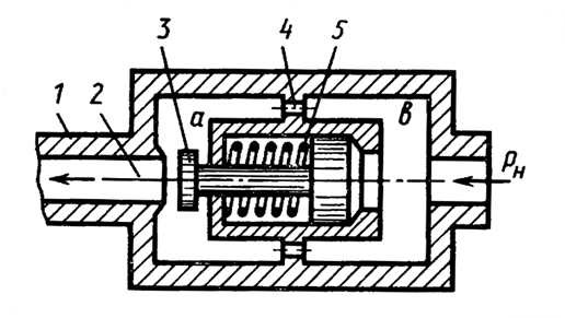 На рисунке показан гидроаппарат, назначение которого заключается в том, что в случае разрушения трубопровода 1 клапан 3 перекрывает отверстия 2 и тем самым препятствует выбросу рабочей жидкости из гидросистемы. При нормальной работе перепад давления