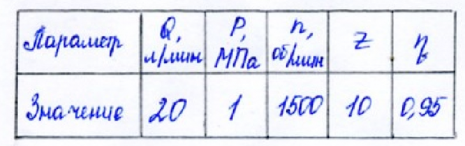 Определить основные параметры шестеренного насоса (диаметр шестеренного колеса, ширину зуба, мощность привода насоса). Представить эскиз шестеренного насоса, описать конструкцию и принцип работы. Рабочие параметры представлены в таблице.