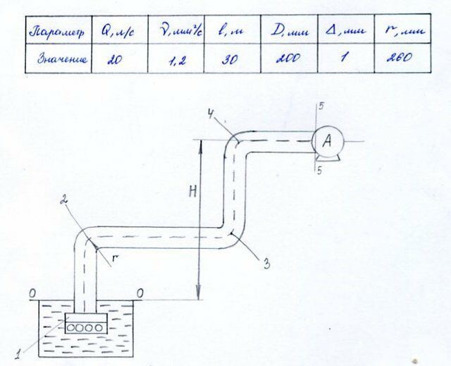 Главная » Учебные материалы » Механика жидкости и газа (МЖГ или Гидравлика) » Решения задач » ВГТУ » Несколько классов/семестров » Выполнить расчет простого трубопровода. Насос А качает жидкость из резервуара. Даны расход жидкости, вязкость жидкости, длина всасывающей трубы, эквивалентная шероховатость, радиус закругления колен трубопровода. Вычислить Н – высоту центра насоса на