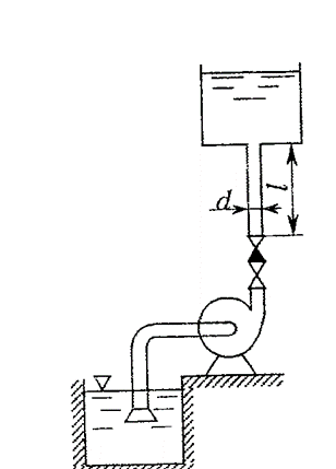 Бензин плотностью ρ = 750 кг/м3 сливается из цистерны в бак по трубе длиной l = 2 м и диаметром d = 20 мм, на которой установлен кран с коэффициентом сопротивления ζкр = 3. Определить расход бензина при известных Н = 2 м и h = 1,3 м, если в верхней ч