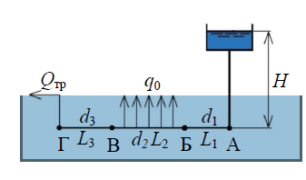 Стальной водопровод, питаемый от водонапорной башни, имеет участок А–Г с непрерывной раздачей по пути q0=(0,05+0,01∙x)=0,08 л/с на 1 пог. м. Расход в конце водопровода Qтр=(5+x)=8л/с. Определить напор у башни Н, если длины участков L1=(250+10∙y)=280м