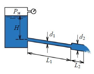 Из бака по стальному трубопроводу вытекает вода температурой t, величина которой определяется по табл. 2. Определение диаметров трубопровода для выделенных на схеме участков производится также при помощи таблицы. Длины этих участков составляют L1=(15+2∙y)=21 м и L2=(3+0,3 x)=3,9м. Отметка трубопровода в месте подключения к баку Zн = (10,2+ x)=13,2м, а отметка в месте начала свободного излива воды из бака Zк=(5,1+x)=8,1м. Напор в баке составляет H=(5+0,7∙y)=7,1м, а избыточное давление на поверхности воды Pм=(1+0,1∙y)=1,3 бар. Необходимо определить пропускную способность трубопровода.