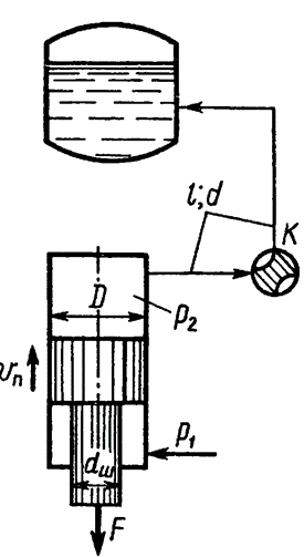 Определить перепад давления в силовом гидроцилиндре Pц, шток которого нагружен постоянной силой F=16 кН, в следующих двух случаях: 1) скорость подъема поршня равна υп=0; 2) υп=0,2 м/с. Диаметри: поршня D=60 мм; штока dш=20 мм. Трубопровод, по которому жидкость движется из гидроцилиндра через распреде­лительK в бачок, имеет длину l=6 м; диаметр d=10 мм. Свойства жидкости: ν=4 Ст; ρ=850 кг/м3. Со­противлением распределителя К пренебречь. Избьггочное давление в баке считать равным нулю, нивелирование высоты не учитьтать.