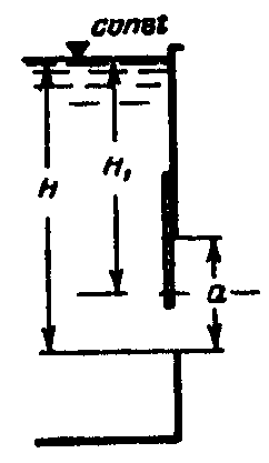 Щитовое отверстие имеет ширину b=1,5 м и высоту а=1,0 м. Щит приподнимается равномерно со скоростью ν=2,5 см/сек (рис. 3-26). Определить объем воды W, вытекающий за время t=40 сек полного открытия отверстия. Напор над центром отверстия H1=3,5 м. Истечение свободное. Коэффициент расхода отверстия μ=0,6=const.