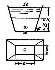 Определить в общем виде время t изменения напоров воды от H1 до H2 при истечении из резервуара, имеющего форму усеченной пирамиды с прямоугольными основаниями (рис. 3-33). Отверстие ω расположено в нижнем (меньшем) основании. Углы наклона граней резервуара к горизонту θ и φ.