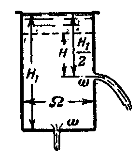 Цилиндрический бак с площадью Ω=3,0 м2 и высотой H1=4,0 м, заполненный до краев водой, нужно опорожнить за время t=5,0 мин. Определить необходимую для этого площадь двух одинаковых отверстий, одно из которых расположено в центре дна, другое в стенке