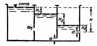 Резервуар разделен на три отсека перегородками, в которых имеются отверстия (рис. 3-13): в первой перегородке прямоугольное с площадью ω1=8,5 см2, во второй перегородке квадратное, примыкающее одной стороной а=4 см к дну. В наружной стенке отверстие круглое d=3,0 см. Разность между отметкой уровня воды в левом отсеке и отметкой центра наружного отверстия H=3,10 м.