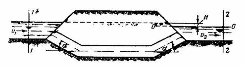 Для отвода воды необходимо под проезжей частью дороги проложить железобетонный дюкер (рис. 2-24). Определить диаметр дюкера, который обеспечил бы пропуск расхода Q=0,95 м3/сек при разности горизонтов H=0,20 м. Длина дюкера l=15 м, угол поворота а=30°. Скорость в верхнем канале υ1=0,7 м/сек, в нижнем υ2=0,8 м/сек. Температуру воды принять t=20° С. Высота шероховатости стенок дюкера =1 мм.