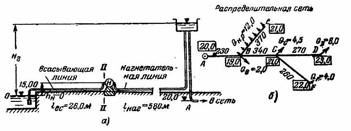 Насосная станция подает воду из водохранилища в водонапорную башню. Из водонапорной башни вода поступает в распределительную сеть (рис. 4-36). Рассчитать всасывающую линию, нагнетательную линию, распределительную сеть и мощность насосной установки пр