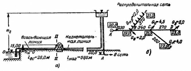 Насосная станция подает воду из водохранилища в водонапорную башню. Из водонапорной башни вода поступает в распределительную сеть (рис. 4-36). Рассчитать всасывающую линию, нагнетательную линию, распределительную сеть и мощность насосной установки при следующих условиях: