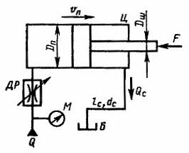 Рабочая жидкость – масло Ж, температура которого 50°С, из насоса подводится к гидроцилиндру Ц через дроссель ДР. Поршень цилиндра со штоком перемещается против нагрузки F со скоростью Vп. Вытесняемая поршнем жидкость со штоковой полости попадает в бак В через сливную линию, длина которой равна lc, а диаметр равен dc.