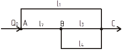 Определить расходы в каждом из простых трубопроводов, если длины равны: l1=5 м, l2=3 м, l3=3 м, l4=6 м, а суммарный расход Q0=6 л/мин.