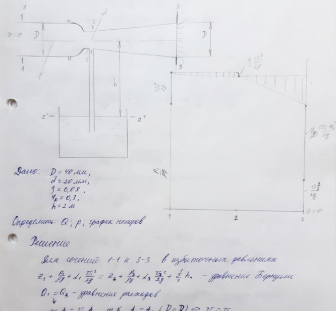 Труба диаметром D = 40мм имеет на конце сходящийся насадок с горловиной d = 20 мм и коэффициентом сопротивления  ζ= 0,08, переходящий в диффузор с коэффициентом потерь φд=0,3, из которого вода вытекает в атмосферу.  Какой расход надо пропускать по трубе и какое при этом будет давление р перед насадком, чтобы в горловину начала поступать вода, подсасываемая на высоту h = 2 м из открытого сосуда.  Построить график напоров при этом расходе. Ответ: Q=2,25 л/с; p=6,5 кПа.