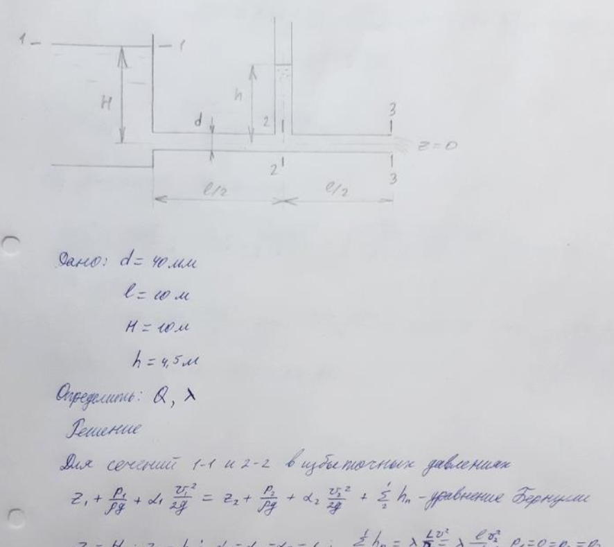 Показать/скрыть дополнительное описаниеПри истечении воды из большого резервуара в атмосферу по горизонтальной трубе, диаметр которой d = 40 мм и длина l = 10м, при статическом напоре Н = 10 м получено, что уровень в пьезометре, установленном по середине длины трубы, h = 4,5 м. Определить расход Q и коэффициент сопротивления трения трубы. Сопротивлением входа в трубу пренебречь. Ответ. Q = 5,5 л/с; λ= 0,036..