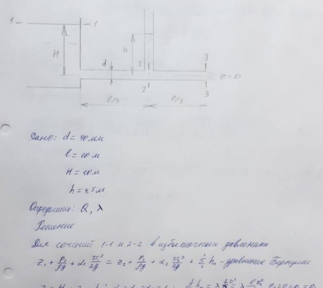 При истечении воды из большого резервуара в атмосферу по горизонтальной трубе, диаметр которой d = 40 мм и длина l = 10м, при статическом напоре Н = 10 м получено, что уровень в пьезометре, установленном по середине длины трубы, h = 4,5 м. Определить расход Q и коэффициент сопротивления трения трубы. Сопротивлением входа в трубу пренебречь. Ответ. Q = 5,5 л/с; λ= 0,036..
