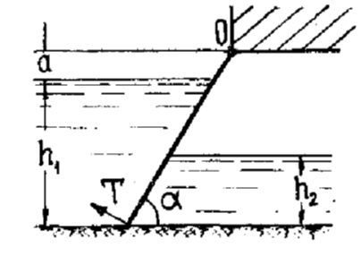 Расчет выполнить аналитическим и графоаналитическим способами. Найти начальное подъемное усилие исходя из условия, что щит при подъеме вращается вокруг шарнира О, а сила тяги Т действует по перпендикуляру к плоскости затвора. Трением в шарнире пренебречь. Превышение шарнира над горизонтом воды перед щитом – а, толщина щита – е. Относительный вес материала, из которого выполнен щит, .