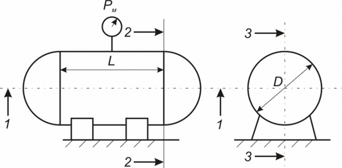 Длина цилиндрической части резервуара L, диаметр D. Манометр показывает манометрическое давление рМ. Температура жидкости 20° С. Определить силы, разрывающие резервуар по сечениям 1-1, 2-2, 3-3.