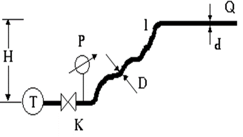 Пожарный прорезиненный рукав внутренним диаметром D и длинной lподсоединен к напорному трубопроводу T через задвижку K, давление после которой р замеряется манометром Рукав заканчивается насадкой (стволом) диаметром на выходе d, коэффициентом сжатия струи e и коэффициентом сопротивления z; он поднят над точкой подсоединения к трубопроводу на высоту H. Под действием