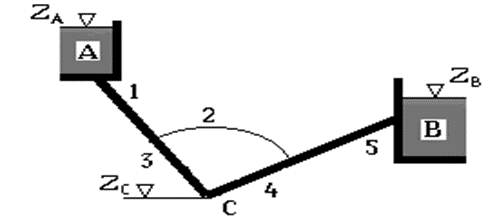 Вода (r = 1000 кг/м3) из резервуара А подается в резервуар В по системе труб, состоящей из пяти участков длиной i из не новых стальных водопроводных труб диаметром di .Отметки уровней воды в резервуарах zA и zB, отметка наинизшего сечения трубопровода на стыке 3-го и 4-го участков zC .