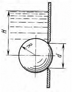 Каков наименьший уровень Н воды в сосуде, при котором стальной шар (относительной плотностью δ = 8) радиусом R =100 мм, перекрывающий круглое отверстие диаметром d = 1,5∙Rв вертикальной стенке, будет находится в равновесии?