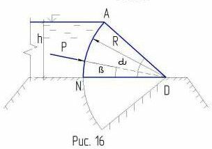 Определить силу давления воды Р и направление ее действия β на секторный затвор (рис.16) при следующих данных: һ = 3 м, α = 45°, R = 4,24 м, ширина затвора В = 1 м.