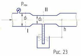 Пренебрегая потерями напора определить диаметр сужения d2 (рис. 23), чтобы при пропуске расхода Q = 7 л/с вода в трубке “a“ подсасывалась на высоту һ = 60 см. Диаметр трубопровода d1 = 100 мм, а манометрическое давление в широком сечении p1ман = 3,9