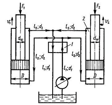 Главная » Учебные материалы » Механика жидкости и газа (МЖГ или Гидравлика) » Решения задач » УГНТУ » Несколько классов/семестров » Номер 3.1 » Вариант 01 » В гидравлической системе автомобиля масло нагнетается в силовые гидроцилиндры подъемного устройства. По заданным нагрузкам на штоки поршней (F1 и F2), характеристике насоса PH = F(Q) и размерам поршней и труб определить скорости перемещения поршней (