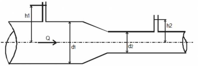 Для студентов УГНТУ по предмету Механика жидкости и газа (МЖГ или Гидравлика)По трубопроводу, имеющему сужение, протекает идеальная жидкость расходом Q. Показания пьезометров h1 и h2, диаметр суженной части d2. Определить диамеПо трубопроводу, имеющему сужение, протекает идеальная жидкость расходом Q. Показания пьезометров h1 и h2, диаметр суженной части d2. Определить диаме