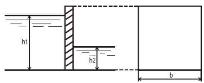 Определить аналитическим и графоаналитическим способами положение центра давления и величину силы давления воды на прямоугольную вертикальную стенку шириной b, если глубина воды перед стенкой h1, а за стенкой h2.