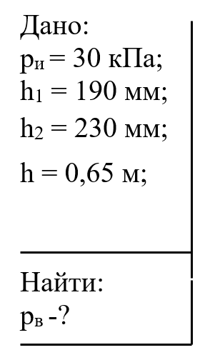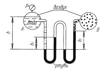 Найти давление воздуха в резервуаре В (рис. 1), если избыточное давление на поверхности воды в резервуаре А равно ри, разности уровней ртути (ρ = 13600 кг/м3) в двухколенном дифференциальном манометре h1 и h2, а мениск ртути в левой трубке манометра