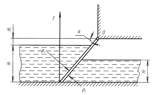 Главная » Учебные материалы » Механика жидкости и газа (МЖГ или Гидравлика) » Решения задач » Несколько классов/семестров » Номер 3 » Щит, перекрывающий канал, расположен под углом к горизонту и закреплен шарнирно к опоре над водой (рис. 3). Определить усилие, которое необходимо приложить к тросу для открытия щита, если ширина щита b, глубина воды перед щитом Н1, а после щита Н2. Ш