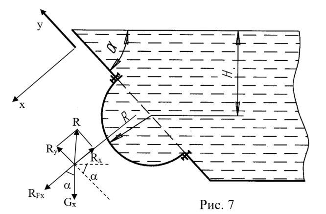 Определить отрывающее и сдвигающее усилия и полную силу давления жидкости на полусферическую крышку радиуса R, если заданы пьезометрический напор воды Н над центром крышки и угол наклона стенки бака к горизонту (рис. 7). (H = 1,4 м; R = 0,4 м; α = 60o ).