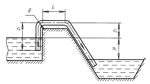 Сифонный бетонный водосброс внешним диаметром d общей длиной l сбрасывает воду из водохранилища в реку, уровень которой на Н ниже уровня водохранилища (рис. 9). Определить подачу сифонного водосброса, если он имеет два поворота: 1 = 900, 2 с радиусам