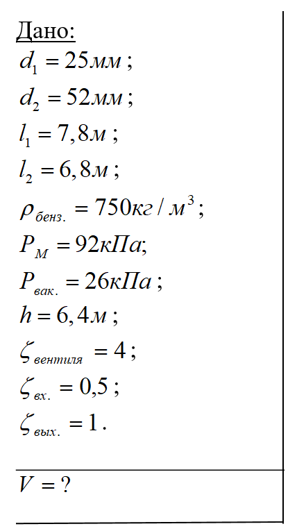 Показать/скрыть дополнительное описаниеПо трубопроводу, состоящему из двух участков труб (см. Рис.) диаметрами и и длиной и подаётся бензин ( ) из бака с избыточным давлением в расположенный выше бак, где поддерживается вакуумметрическое давление . Разность уровней в баках . Коэффициент сопротивления трения для труб , коэффициенты местных сопротивлений ; ; . Требуется определить расход бензина ..