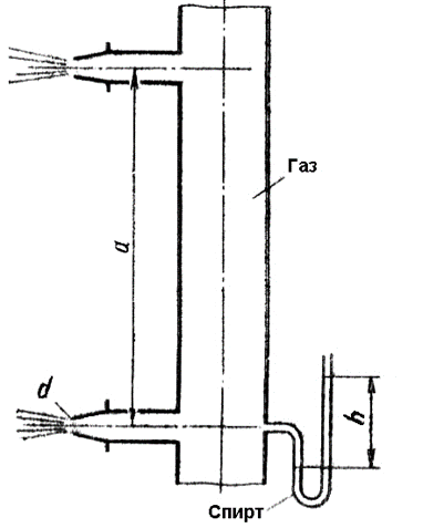 Газ, заполняющий вертикальную трубу, вытекает в атмосферу через два насадки диаметром d = 10 мм, расположенные по высоте трубы на расстоянии a = 100 м друг от друга. Коэффициент расхода насадков (с учетом сопротивления подводящих горизонтальных трубок) μ = 0,95. Определить массовый расход M газа через каждый насадок, если показание спиртового манометра, присоединенного к трубке у нижнего насадка, h = 200 мм (плотность спирта ρсп = 800 кг/м3). Давление атмосферного воздуха на уровни нижнего насадка pат = 100 кПа, температура воздуха и газа t = 20 °C. Значения удельной газовой постоянной воздуха Rв = 287 Дж/(кг ⋅ К) и газа Rг = 530 Дж/(кг ⋅ К). Скоростным напором и потерями в трубе пренебречь, плотность воздуха и газа принимать постоянными по высоте a.