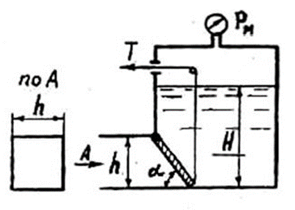Главная » Учебные материалы » Механика жидкости и газа (МЖГ или Гидравлика) » Решения задач » ИрГАУ » Несколько классов/семестров » Номер 23 » Поворотный клапан закрывает выход из бензохранилища в трубу квадратного сечения. Определить, какую силу Т нужно приложить к тросу для открытия клапана при следующих данных: h=0,4 м; Н=1,0 м; α=30°; плотность бензина ρб=700 кг/м3. Манометрическое давл