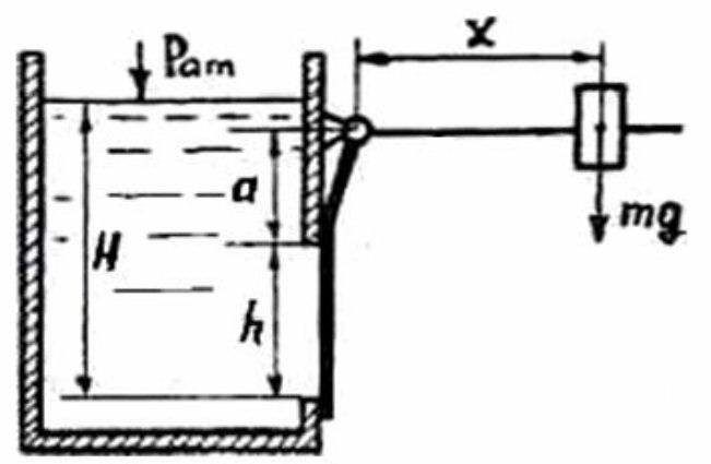Квадратное отверстие со стороной h = 1 м в вертикальной стенке резервуара закрыто плоским щитом. Щит закрывается грузом массой m, на плече х=1,3 м. Определить величину массы груза, необходимую для удержания глубины воды в резервуаре H = 2,5 м, если величина а = 0,5 м. Построить эпюру гидростатического давления на щит.