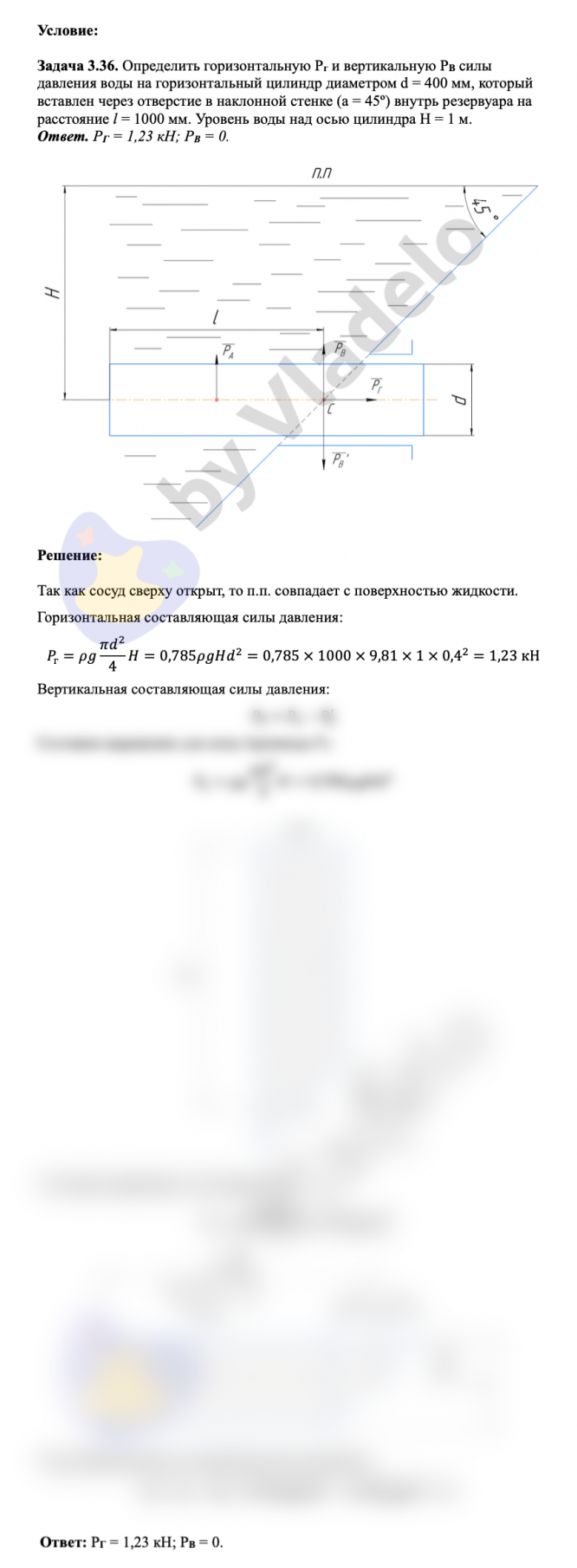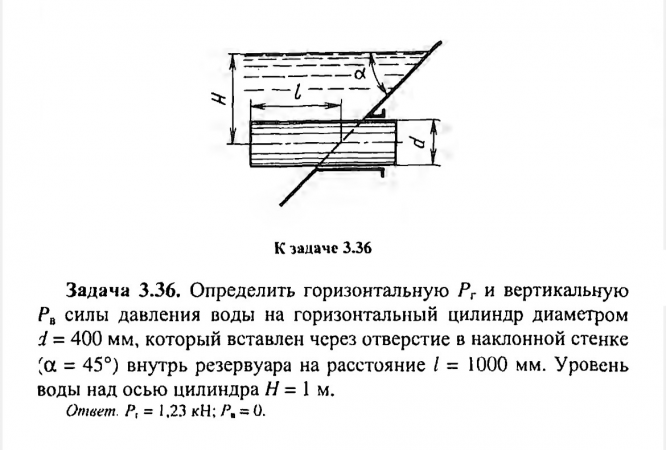 Задача 3.36. Определить горизонтальную Рг и вертикальную РВ силы давления воды на горизонтальный цилиндр диаметром d = 400 мм, который вставлен через отверстие в наклонной стенке (а = 45º) внутрь резервуара на расстояние l = 1000 мм. Уровень воды над осью цилиндра H = 1 м. Ответ. РГ = 1,23 кН; РВ = 0..