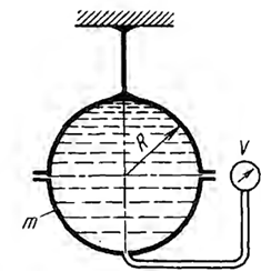 Шаровой сосуд радиусом R=0,4 м, заполненный водой, висит на тяге, прикрепленной к его верхней половине. Какое наименьшее давление в центре сосуда (показание пружинного мановакуумметра П) удержит свободную нижнюю половину сосуда весом m=150кг?