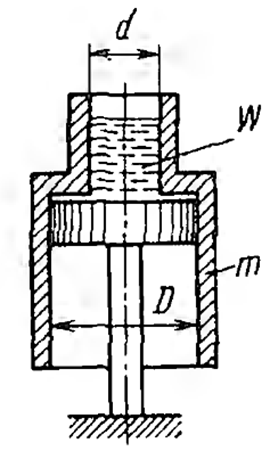 Покоящийся на неподвижном поршне и открытый сверху и снизу сосуд весом m = 16 кг состоит из двух цилиндрических частей, внутренние диаметры которых равны D=0,5 м и d= 0,3 м. Определить, какой минимальный объем W воды должен быть налит в верхнюю часть сосуда, чтобы сосуд всплыл над поршнем. Трением сосуда о поршень пренебречь.