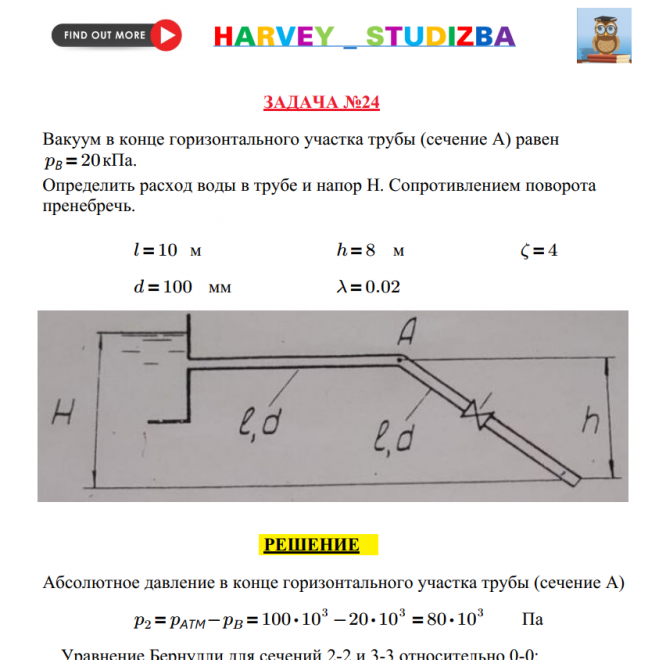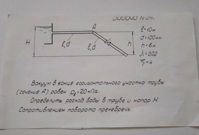 Для студентов по предмету Механика жидкости и газа (МЖГ или Гидравлика)Вакуум в конце горизонтального участка трубы (сечение А) равен рв=20 кПа. Определить расход воды в трубе и напор Н. Сопротивлением поворота пренебречьВакуум в конце горизонтального участка трубы (сечение А) равен рв=20 кПа. Определить расход воды в трубе и напор Н. Сопротивлением поворота пренебречь