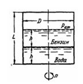 Замкнутый цилиндрический сосуд размерами D = 400 мм и L = 400 мм, вращающийся с числом оборотов n = 3000 об/мин, заполнен равными объемами воды и бензина (δ = 0,7), образующими слои одинаковой высоты h = 150 мм. 1) Определить, пренебрегая весомостью жидкости наибольшее давление в сосуде. 2) Растягивающие усилия Р1 и P2 в осевом сечении сосуда и в сечении, перпендикулярном его оси.