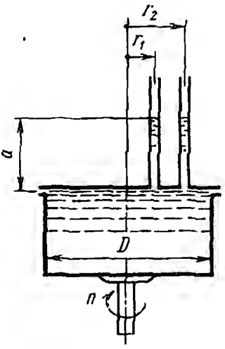 Цилиндрический сосуд диаметром D = 1,2 м, наполненный водой до высоты а = 0,6м в пьезометрах одинакового диаметра, установленных на крышке сосуда на расстояниях r1 = 0,2 м и r2 = 0,4 м от оси, вращается с числом оборотов n = 60 об/мин. Определить силу давления на крышку сосуда и указать, как она будет меняться качественно, если поочередно выключать пьезометры.