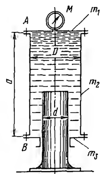 Определить показание манометра М и усилия в болтовых группах А и В, если вес верхней крышки сосуда равен m1 = 300 кг, вес цилиндрической части сосуда m2 = 150 кг, вес нижней крышки сосуда m3 = 120 кг. Каким может быть взят минимальный диаметр плунжера, если наибольшее допускаемое давление M=3 МПа?