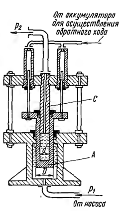 Гидравлический мультипликатор (устройство для повышения давления) получает от насоса воду под давлением P1 = 0,5 МПа. Заполненный водой подвижный цилиндр А с внешним диаметром D = 200 мм скользит по неподвижной скалке С, имеющей диаметр d = 50 мм, создавая на выходе из повысителя давление P2. Определить давление P2, принимая силу трения в сальниках равной 10% от силы, развиваемой на цилиндре давлением P1, и пренебрегая давлением в линии обратного хода. Масса подвижных частей мультипликатора m = 204кг.