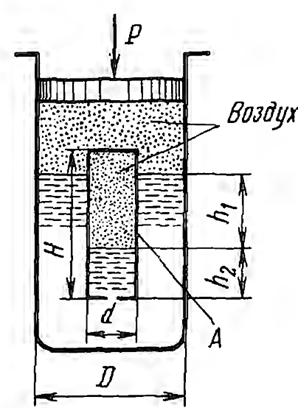 Задача (Куколевский И.И.) 1-27 Тонкостенный сосуд А высотой H = 60 мм и диаметром d = 24 мм с отверстием внизу плавает в воде, содержащейся в цилиндре диаметром D = 72 мм. Определить: