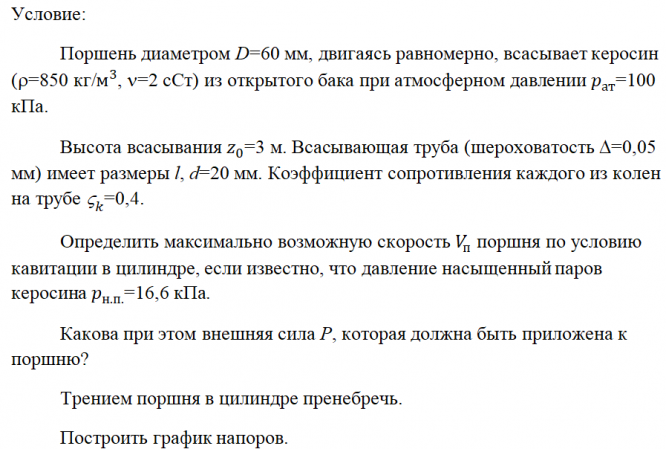 Для студентов по предмету Механика жидкости и газа (МЖГ или Гидравлика)Поршень диаметром D=60 мм, двигаясь равномерно, всасывает керосин (=850 кг/м^3, =2 сСт) из открытого бака при атмосферном давлении p_ат=100 кПа. ВысПоршень диаметром D=60 мм, двигаясь равномерно, всасывает керосин (=850 кг/м^3, =2 сСт) из открытого бака при атмосферном давлении p_ат=100 кПа. Выс