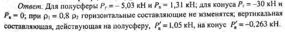 Показать в виде векторов горизонтальные и вертикальные составляющие сил давления жидкости на полусферу и конус. Как изменяться силы при ρ1 = 0,8, ρ2 = 800 кг/м3?
