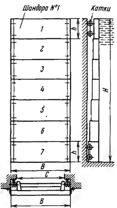 В плотине сделан прямоугольный проем размером Н*С, через который вода поступает к турбине. При ремонте турбины этот проем закладывается семью специальными бачками-щандорами 1. Размер каждой шандоры h*B= 1,2*3,4 м2. Все шандоры имеют по две пары катков.